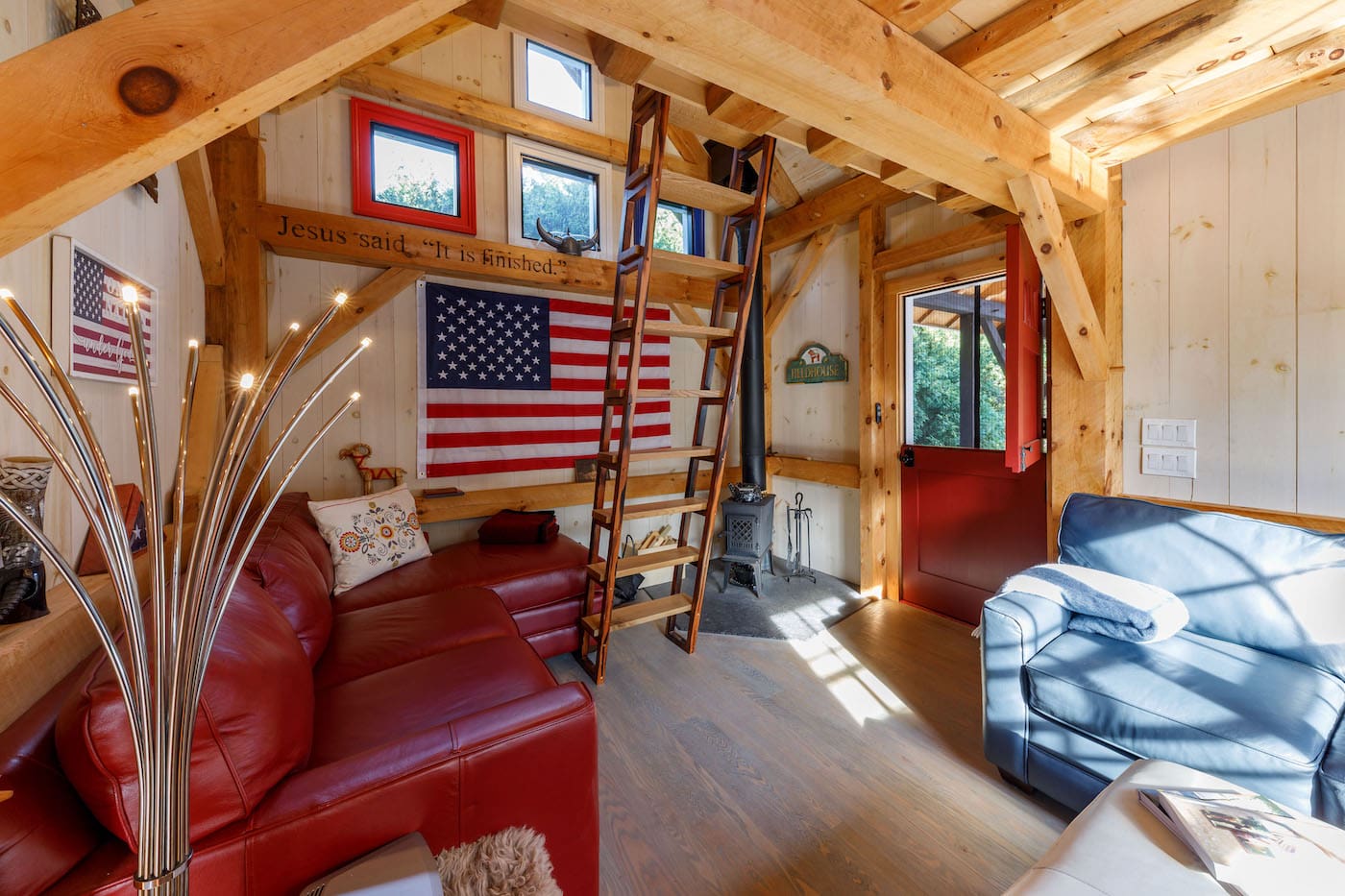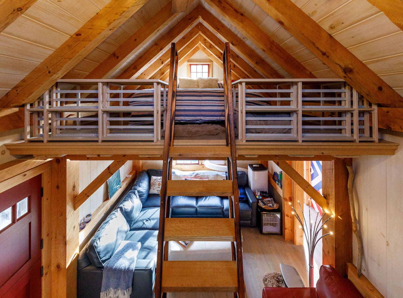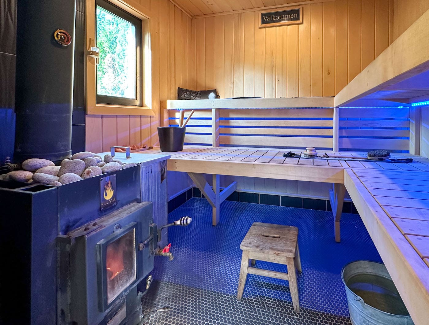 The Alaskan yellow cedar-lined sauna serves as a serene centerpiece within the space, featuring exterior siding sourced from a nearby mill. An American-made stove brings the heat and merges tradition with modern comfort. Beneath the cozy upper level sleeping area is a spacious living space designed for both relaxation and entertainment.