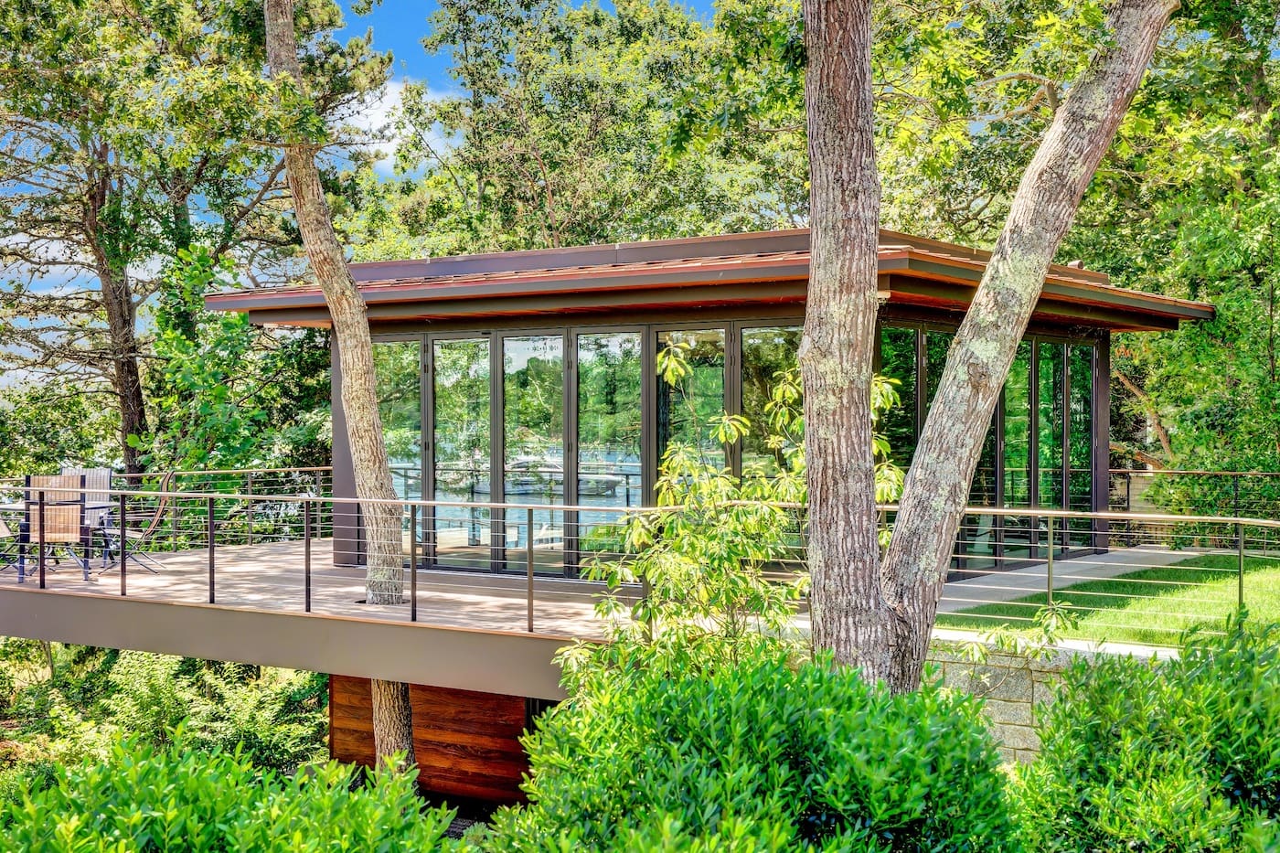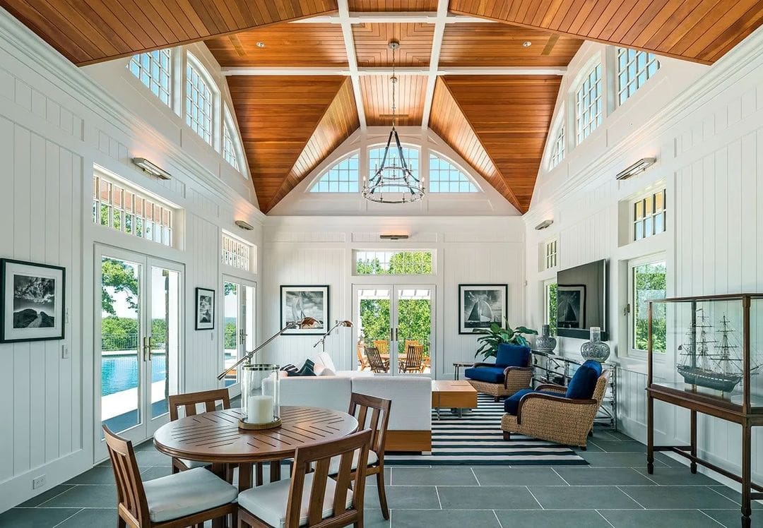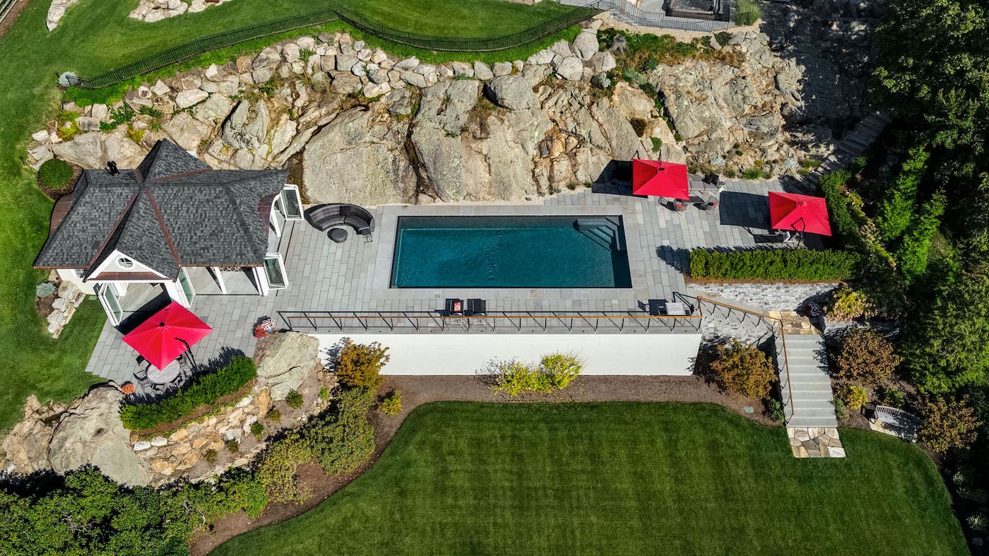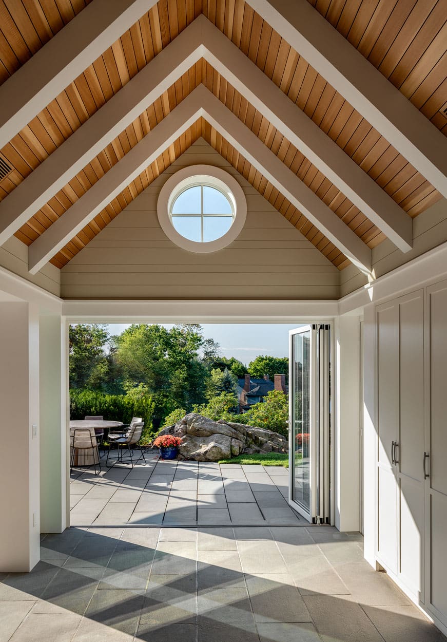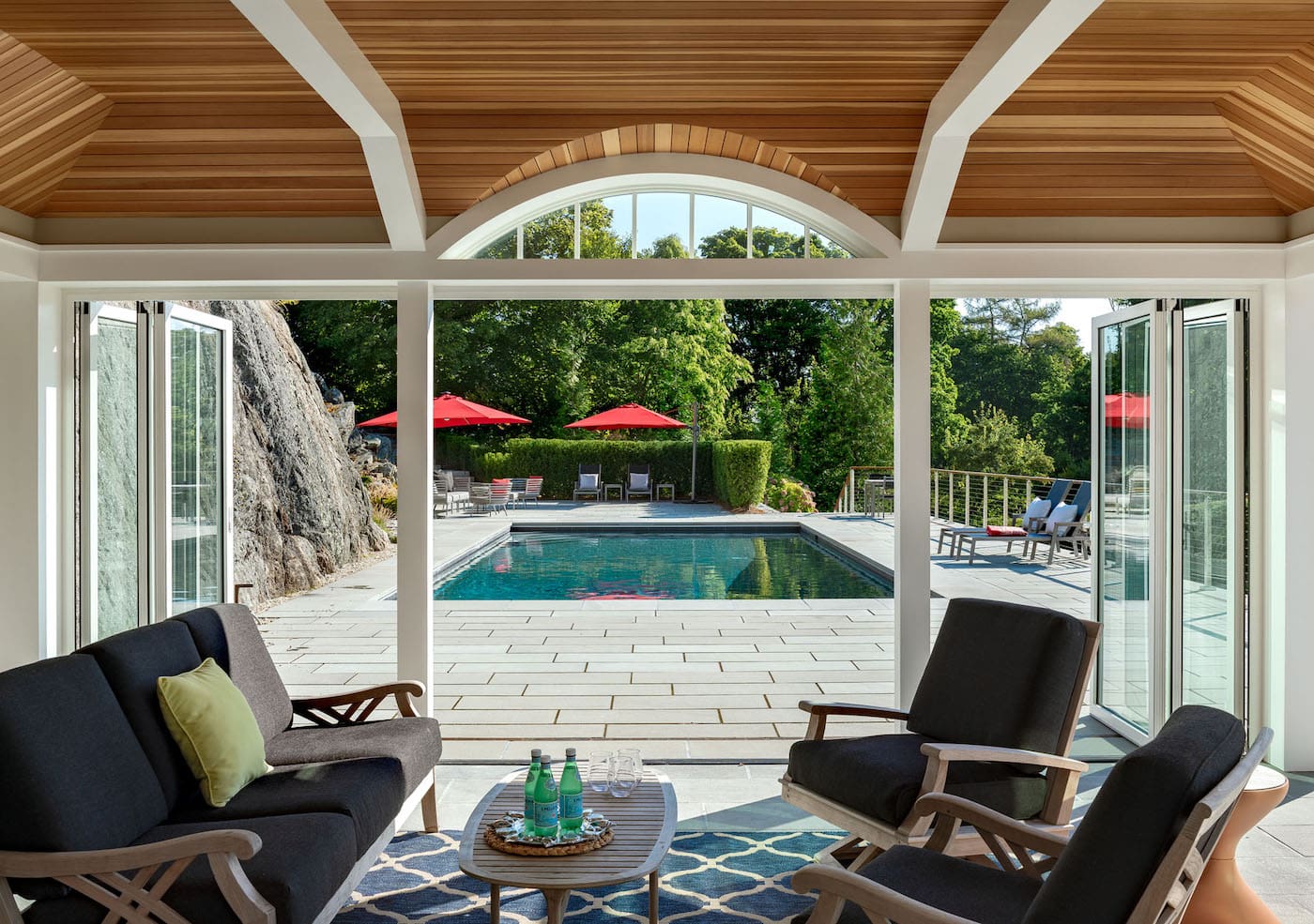 To keep the pool deck sleek, a discreet hatch that blends into the surrounding bluestone floors cleverly conceals the pool’s mechanical equipment. With cedar shingle siding, eyebrow and captions windows, and copper roof details, the pool house exterior flawlessly matches the look of the main home on the cliff above, which was also fully renovated by CM Ragusa.