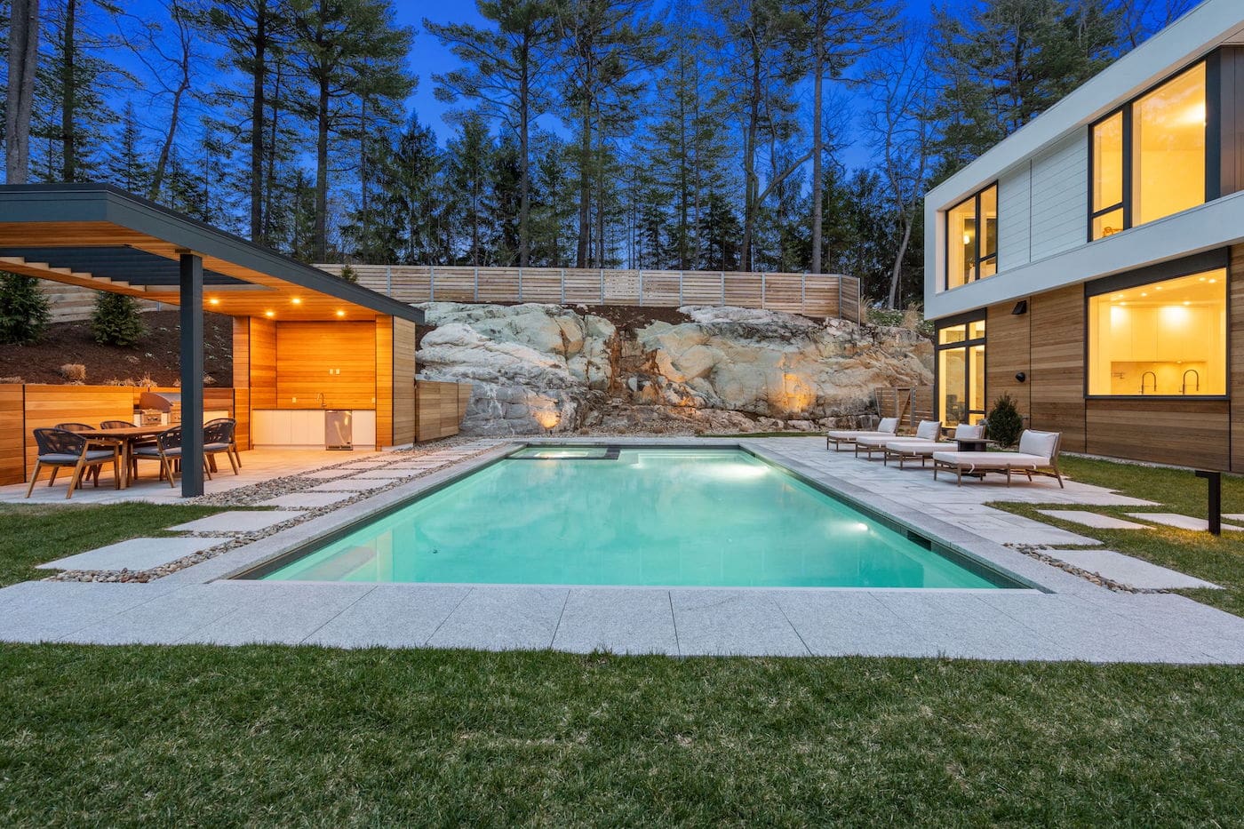 Situated on a hill that overlooks the Boston city skyline, this private stretch of property makes the most of its vast site. The gorgeous millwork shown on the main home continues in the poolside retreat, where the finishes give it a personality all its own.