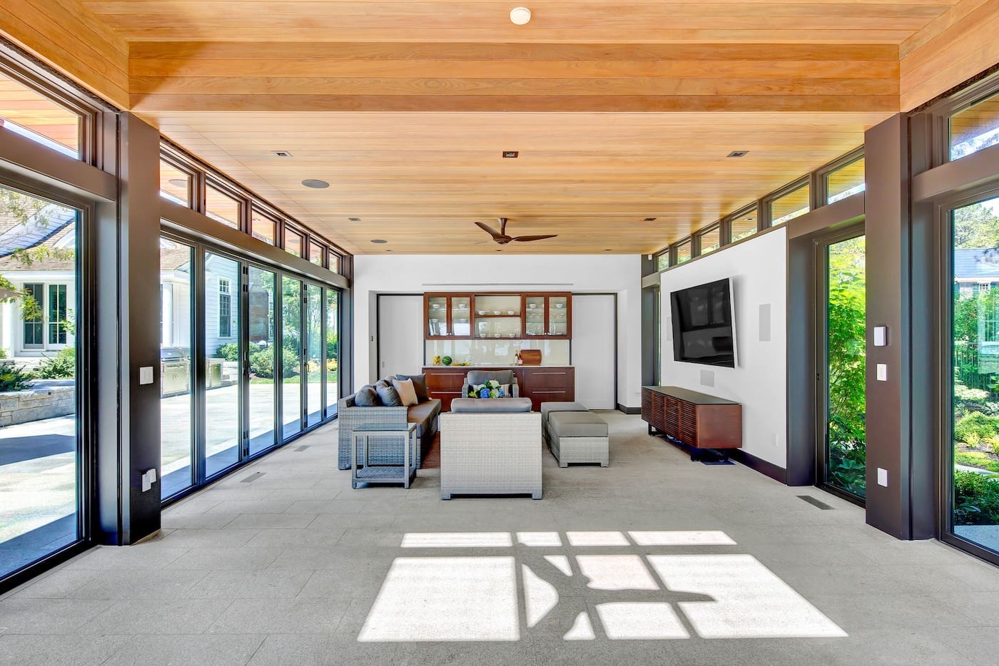 Al fresco is the move in this tricked out cabana, fitted with marine grade custom cabinetry and everything you need for poolside entertainment. A cedar exterior with Fry Reglet modern corners echoes the contemporary vibe of the adjacent primary home.