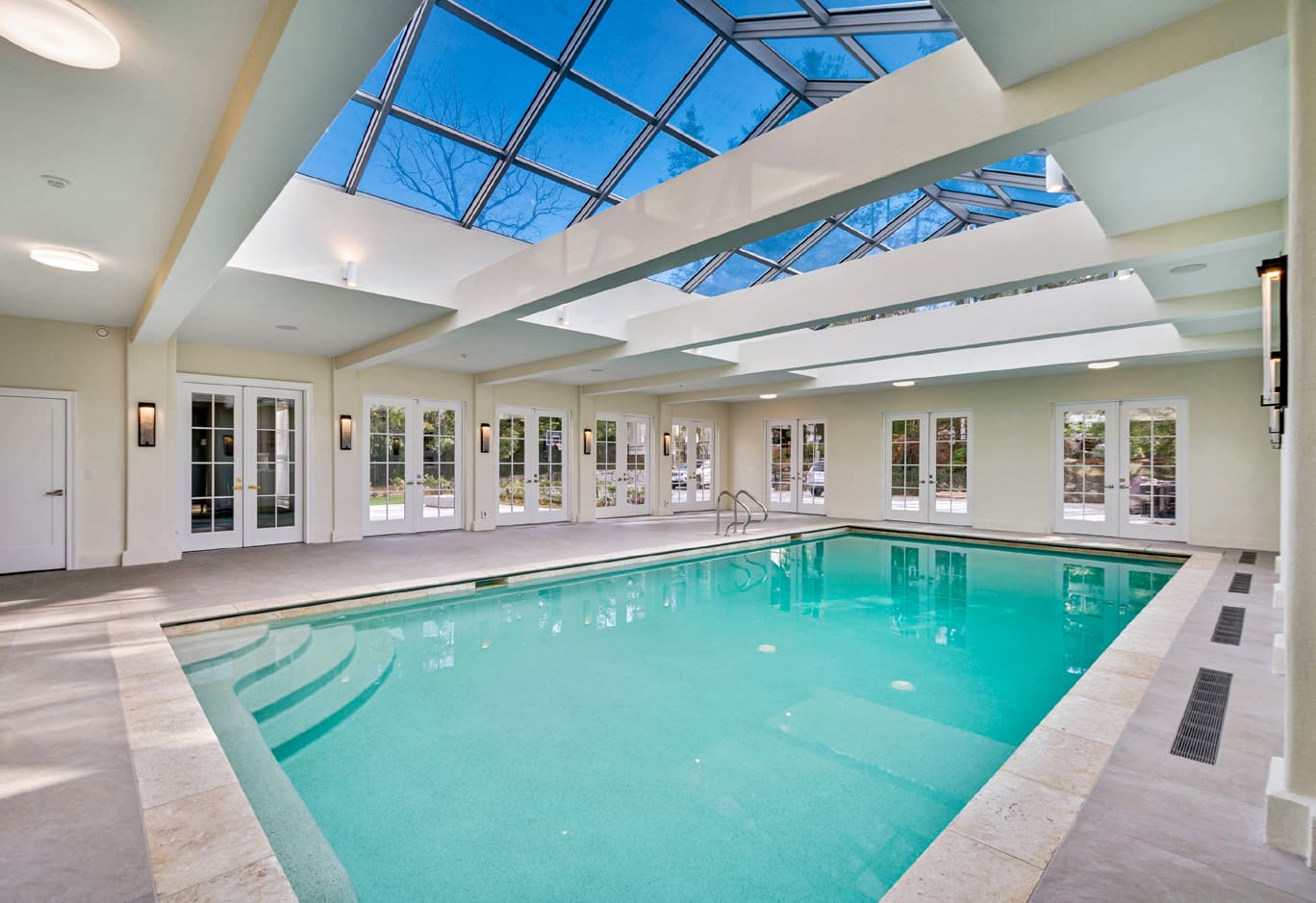 This stunning natatorium was part of a full-scale renovation of a charming old-world Georgian Revival home, reimagined for the modern era. The natatorium underwent a complete reconstruction to accommodate a brand-new pool deck, an advanced climate control system, an integrated swim gym technology system, a secret vault for pool equipment storage, and a stunning fiberglass skylight that invites the outdoors in.
