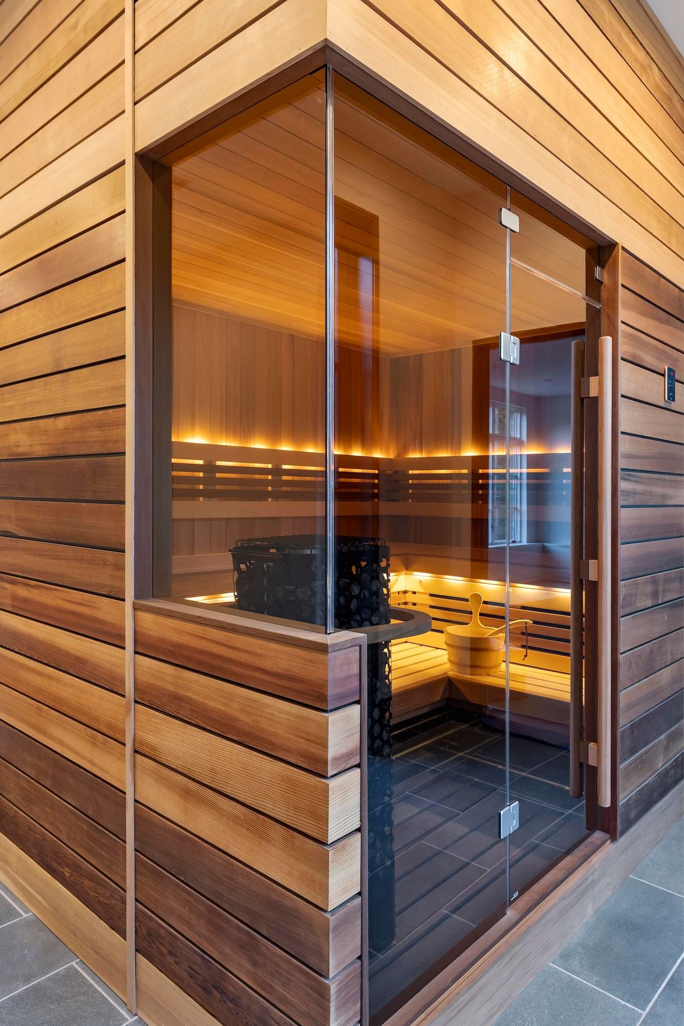 Overlooking a stretch of woodlands beyond, this home spa is as serene as it is stunning. It includes an elegant fireplace that is transparent to the outdoors, an indoor spa designed by Combined Energies Inc., and a striking lighting system above. The entire space features the same modern prairie style as the rest of the property. he retreat space is complete with a sauna and home gym. Yes, please!