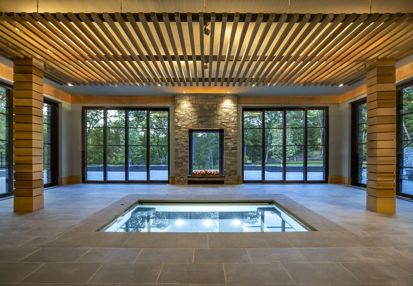 The height of the pool was raised, and the pool itself was completely resurfaced. This space was built to be enjoyed year round, with easy access to an adjacent outdoor seating area.