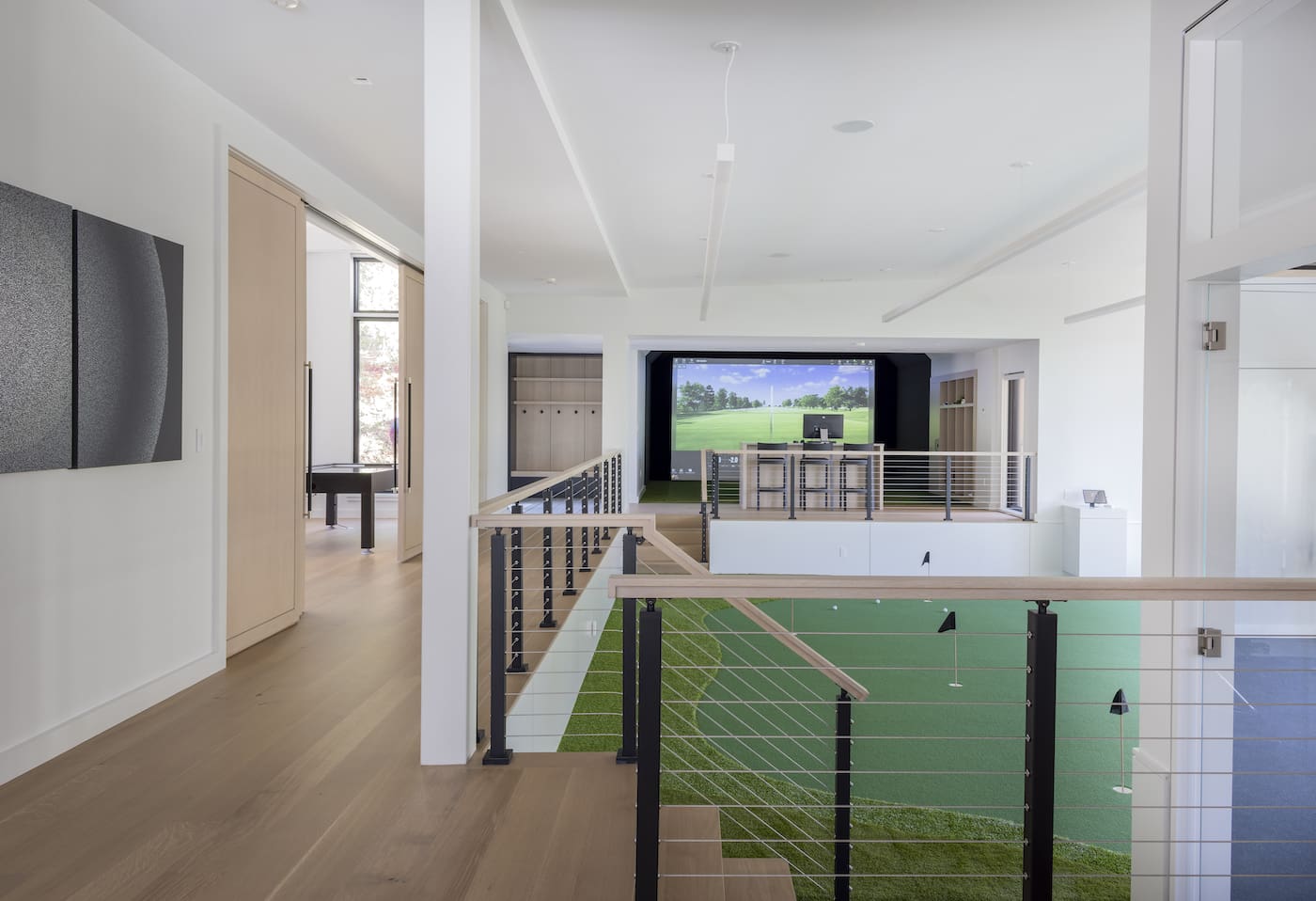 Nestled by lush woodlands and next door to the primary home, this family sports complex and retreat space is complete with a squash court,  kitchen, recreation lounge, guest suite, gym, indoor putting green and golf simulator.