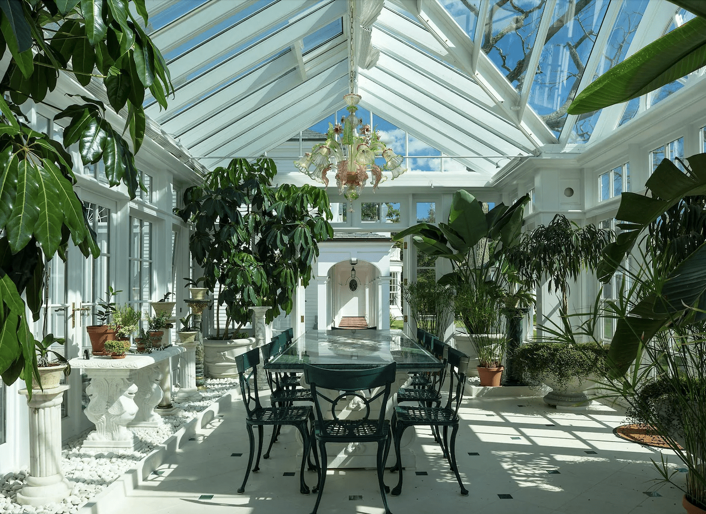 This sun-filled secondary space is a plant lover’s dream, equally stunning from the inside and outside. The details truly bring the terrarium to life, with an organic chandelier that draws the eye toward the sky above. This bright space is a perfect place to enjoy afternoon tea, quiet reading time, or simply to stroll amongst the greenery.