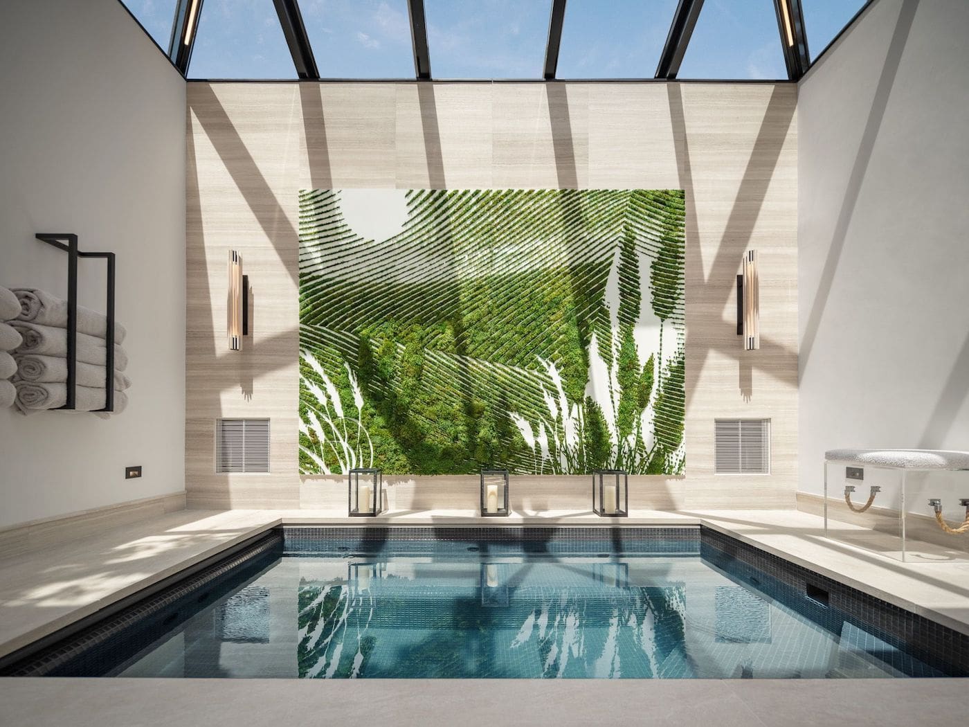Limestone walls and light ashwood sconces frame the feature wall centerpiece, and offer a stunning vista from the stainless steel and glass tile pool. A thermally broken Hope’s door provides a grand entrance from the courtyard to the spa.