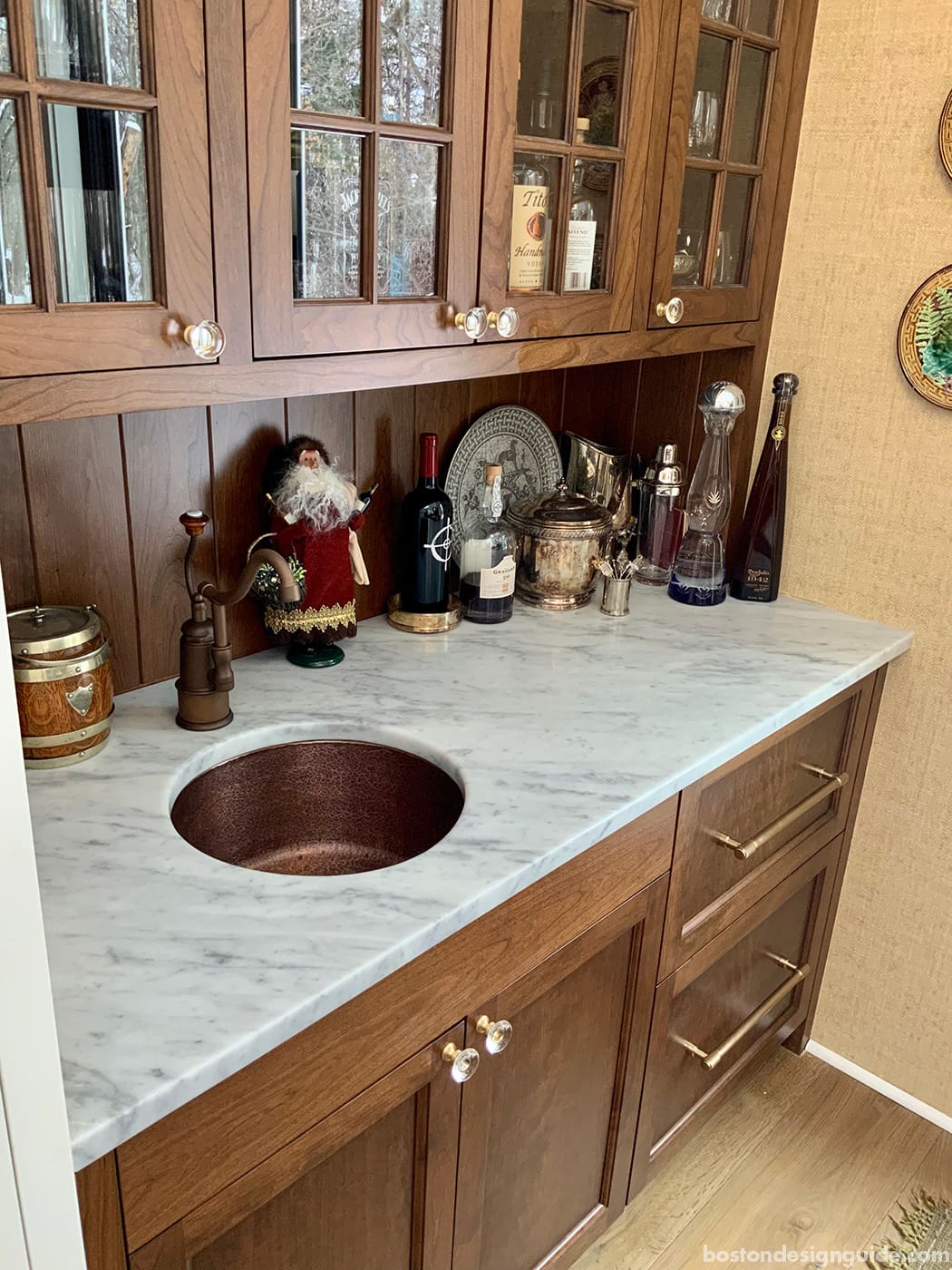 To bring warmth and character to her new wet bar, Melanie opted for a hand-hammered beauty of a sink by Oregon Copper. The patina of the round sink makes an elegant statement, particularly when paired with Herbeau’s “De Dion” Single Lever Mixer, a stylish French export with an attractive wooden handle.